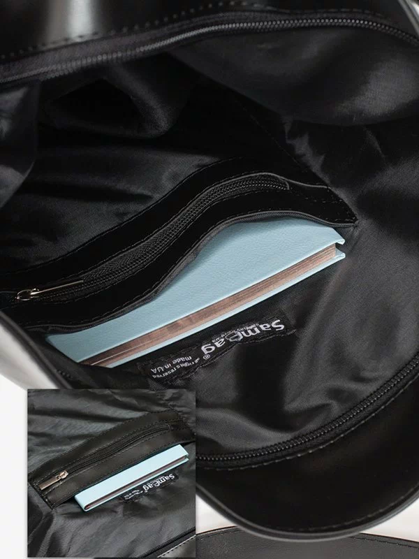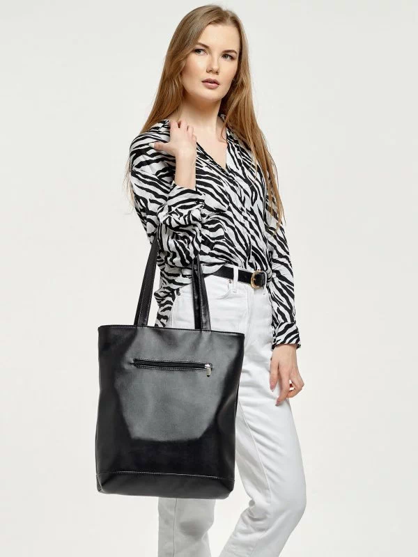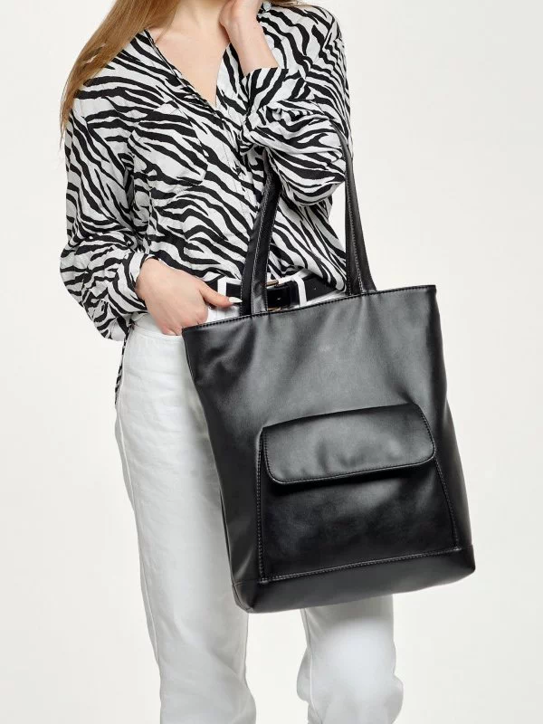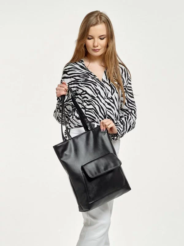 Чорно-біла сумка-шопер з кишенею на магніті з еко-шкіри