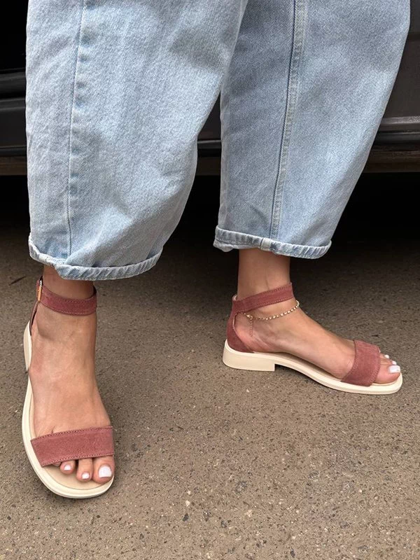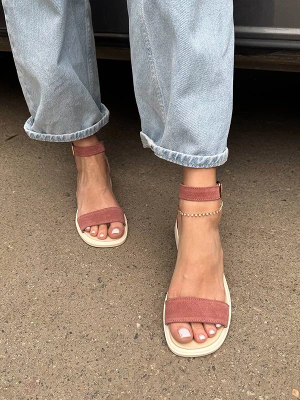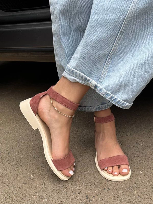 Замшеві сандалії низький хід у темно-пудровому виконанні