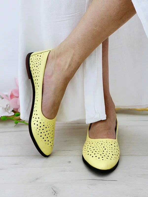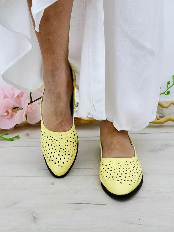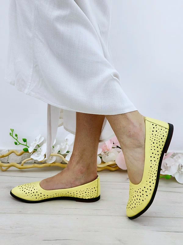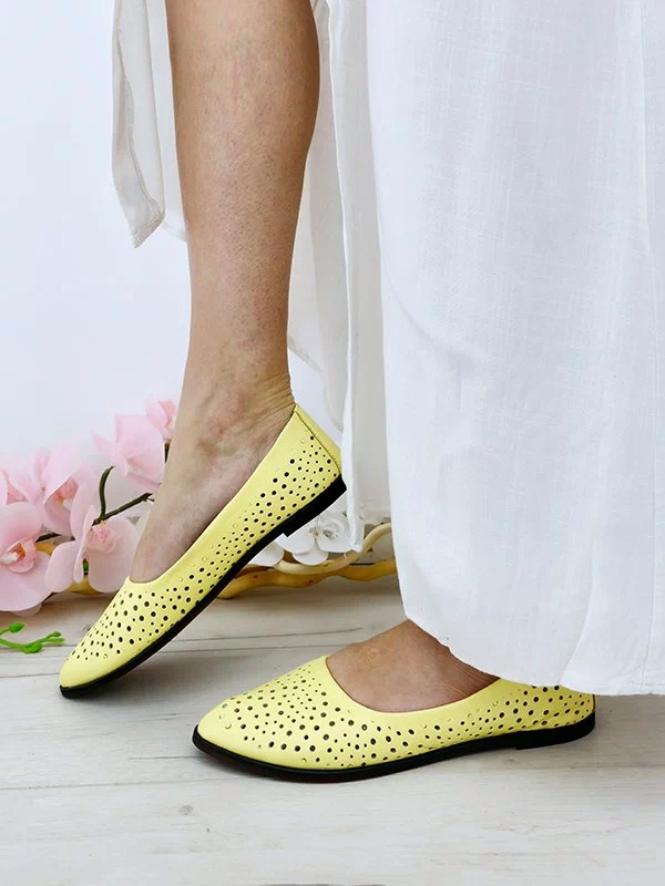 Светло-желтые кожаные летние балетки с перфорацией «в горошек»
