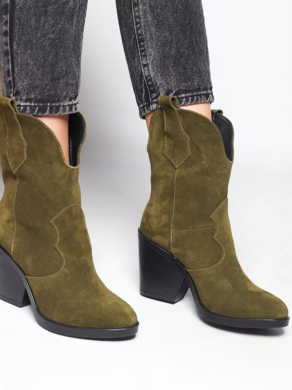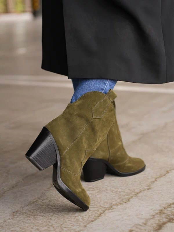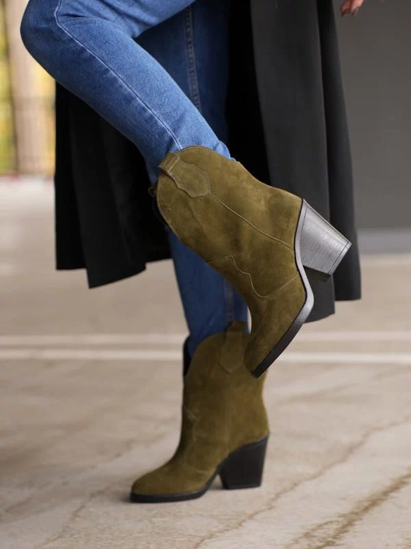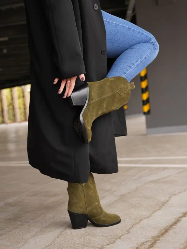 Яркие зимние женские ботильоны-казаки оттенка «хаки» на любые случаи жизни.