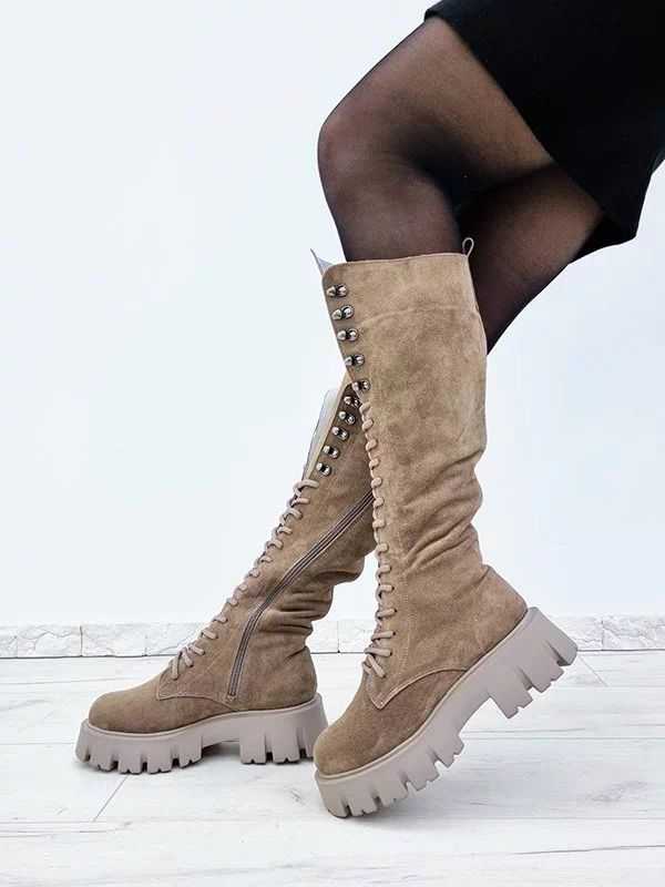 Бежевые высокие замшевые осенние ботинки на байке