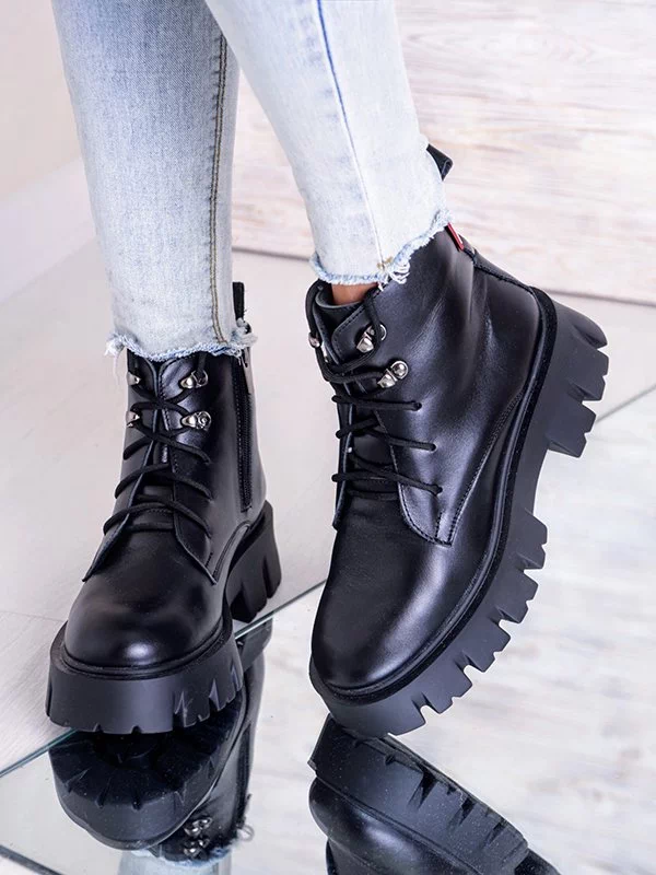 Кожаные зимние ботинки черного цвета на толстой подошве