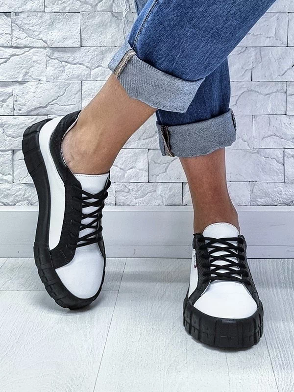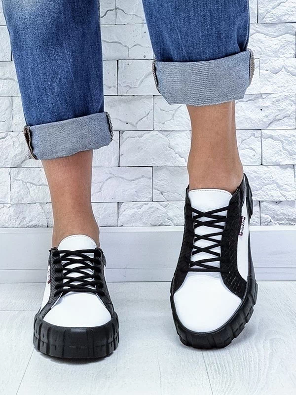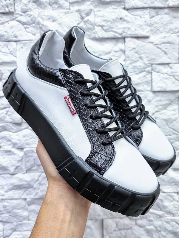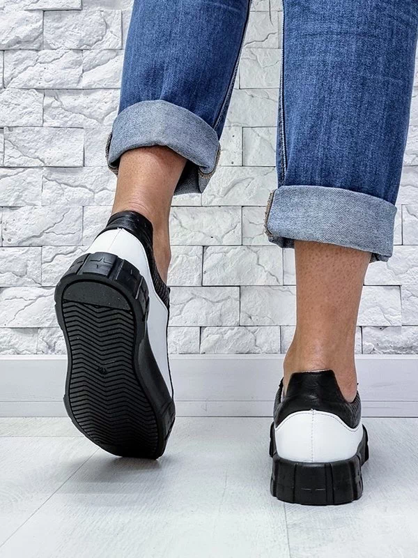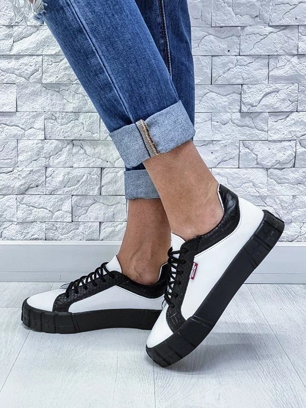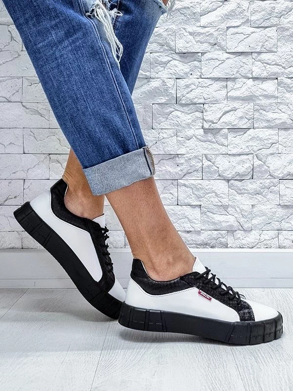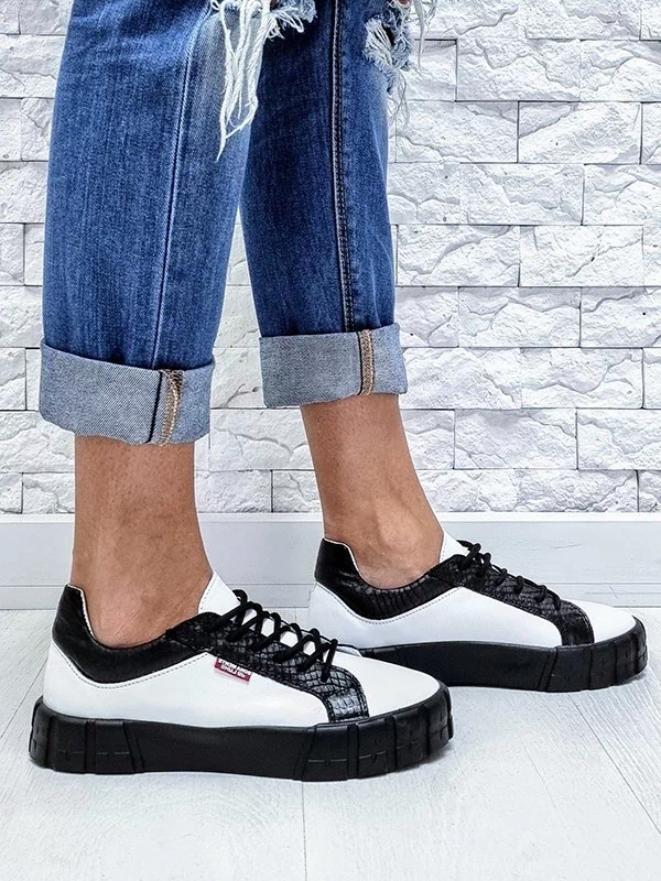 Белые кожаные кеды с чёрными вставками «под рептилию»