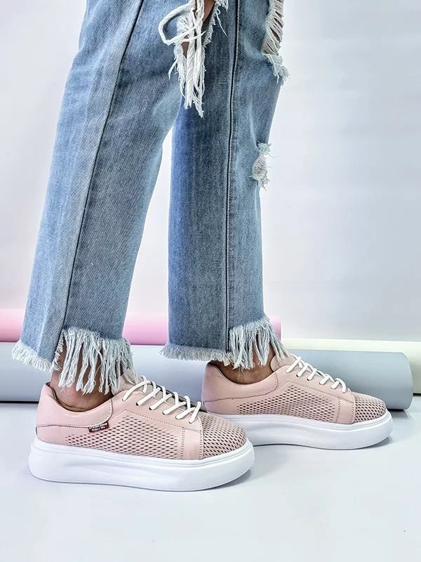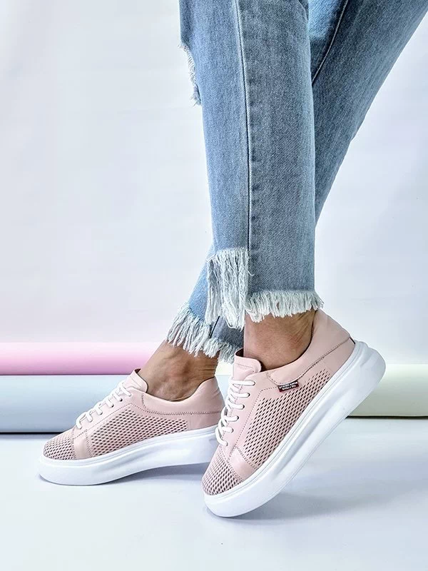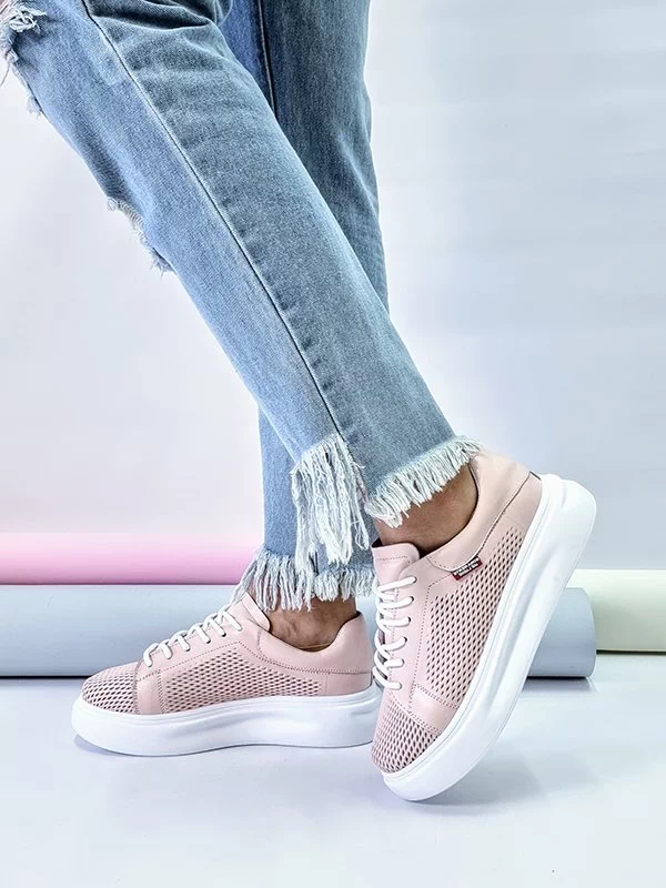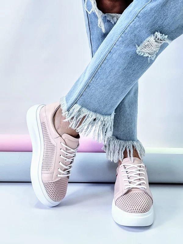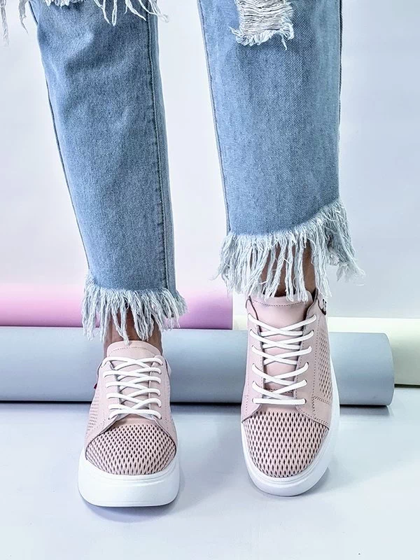 Летние кожаные кеды оттенка «пудра» на толстой подошве