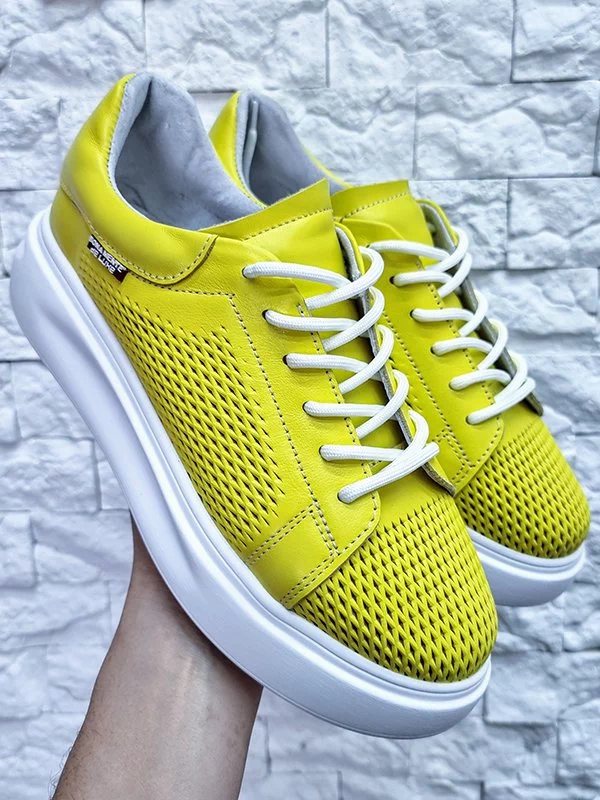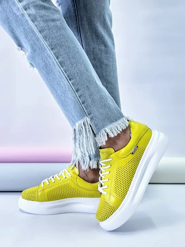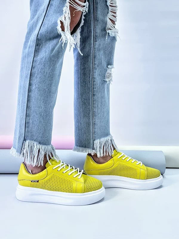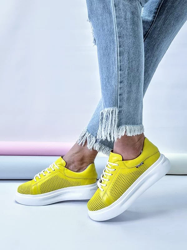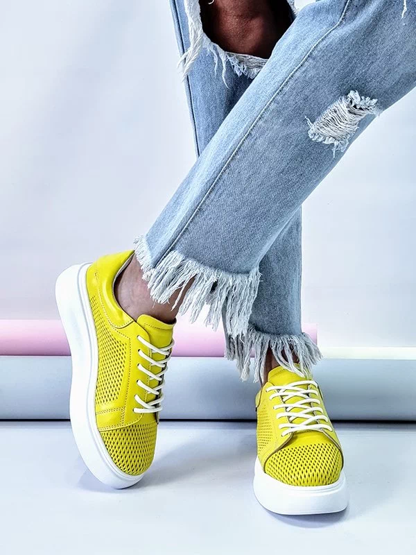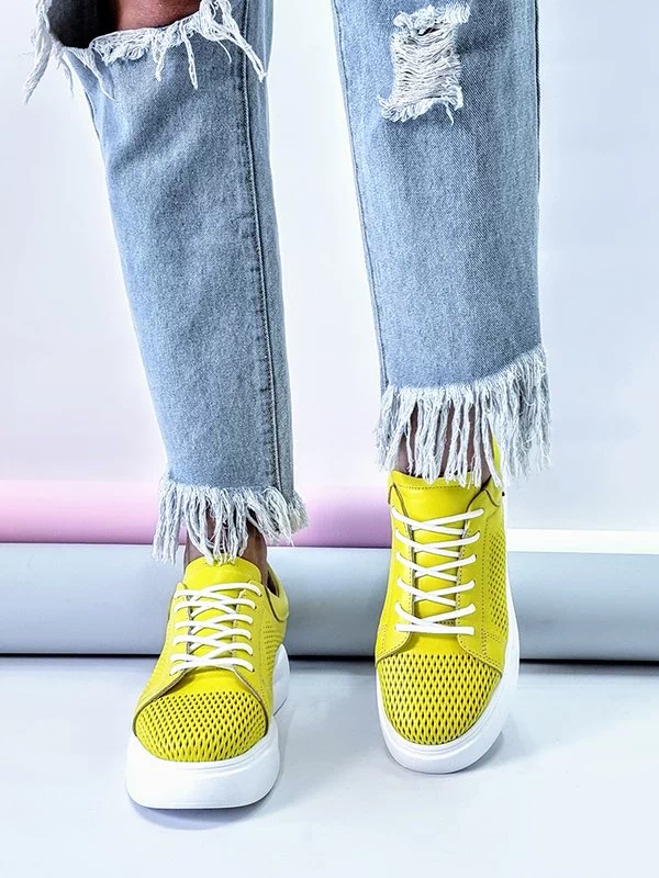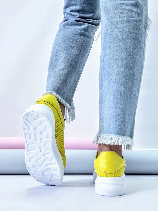 Жёлтые летние кожаные кеды на толстой подошве