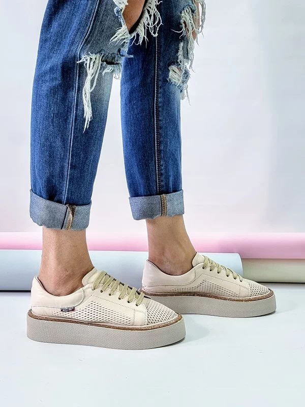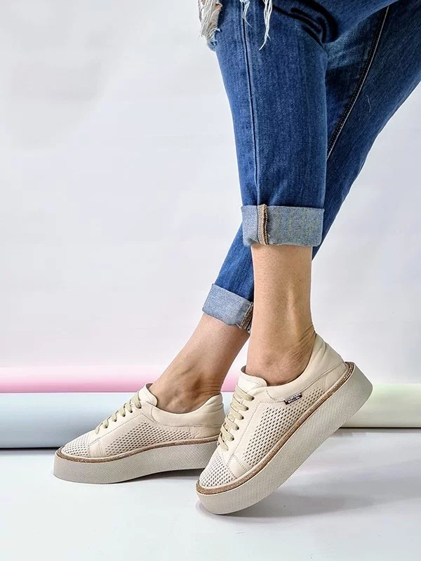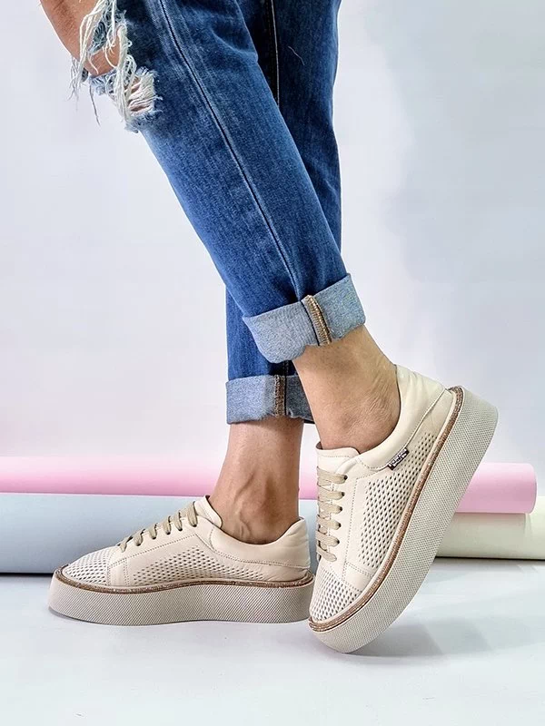Бежевые летние кожаные кеды со сквозной 3D-перфорацией
