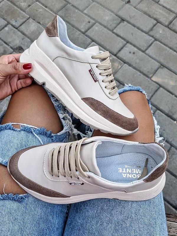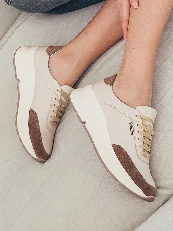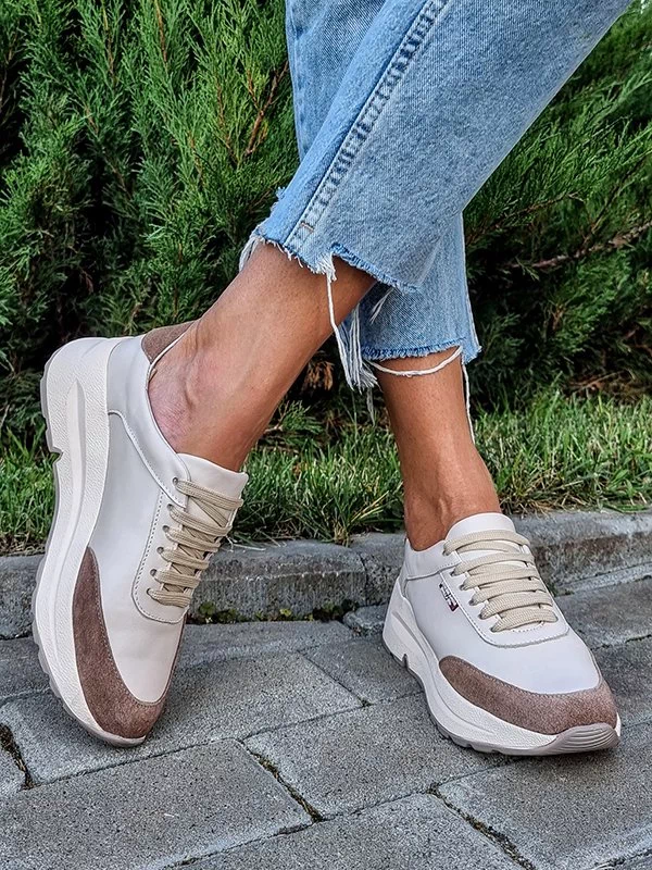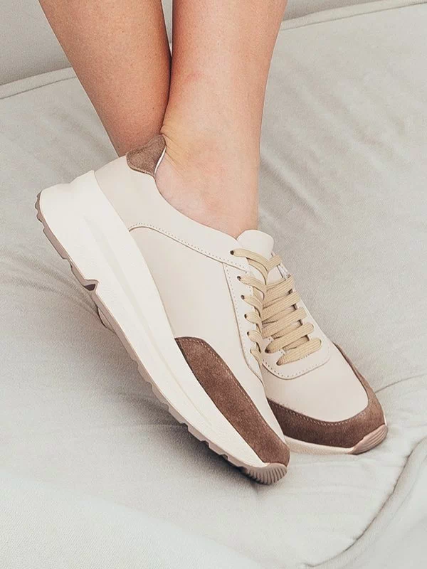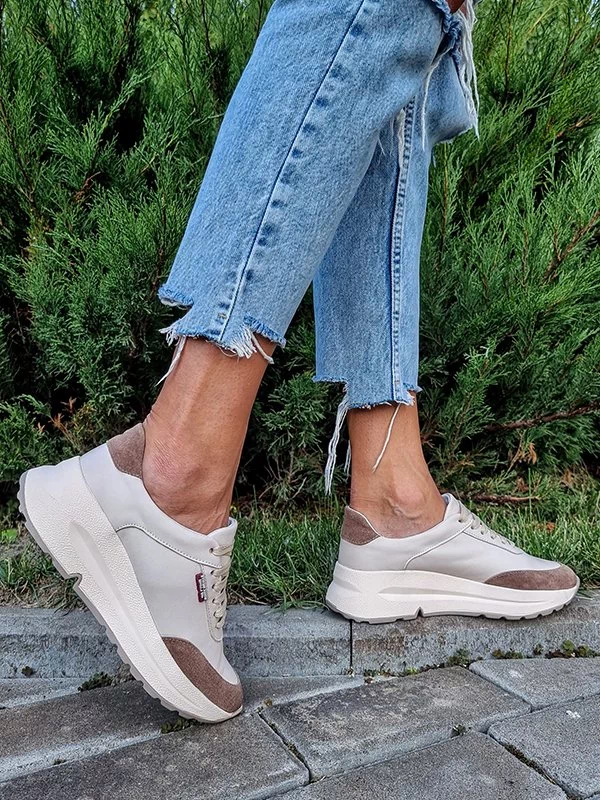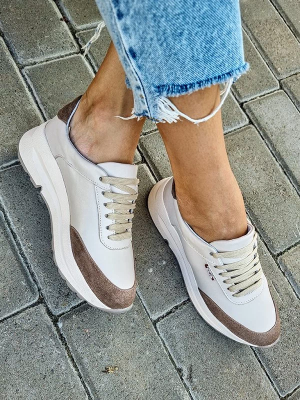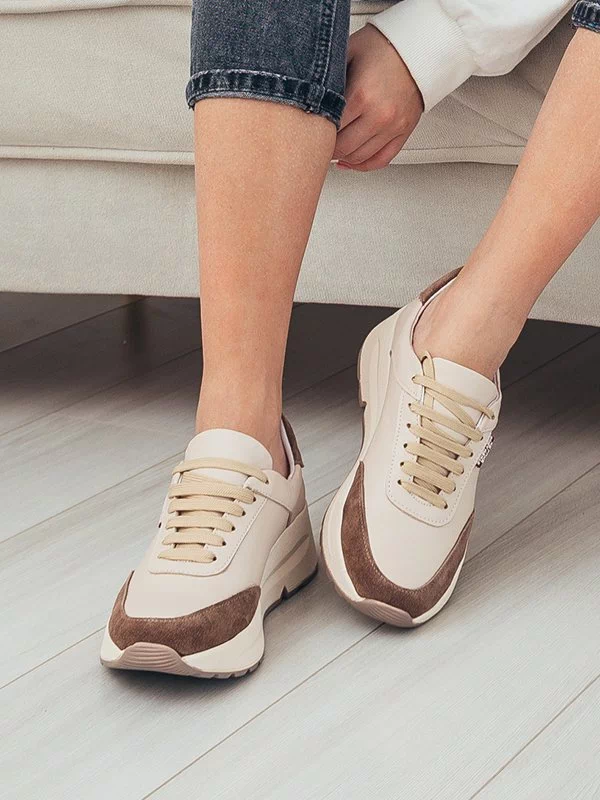 Бежевые кожаные кроссовки с коричневыми вставками из замши