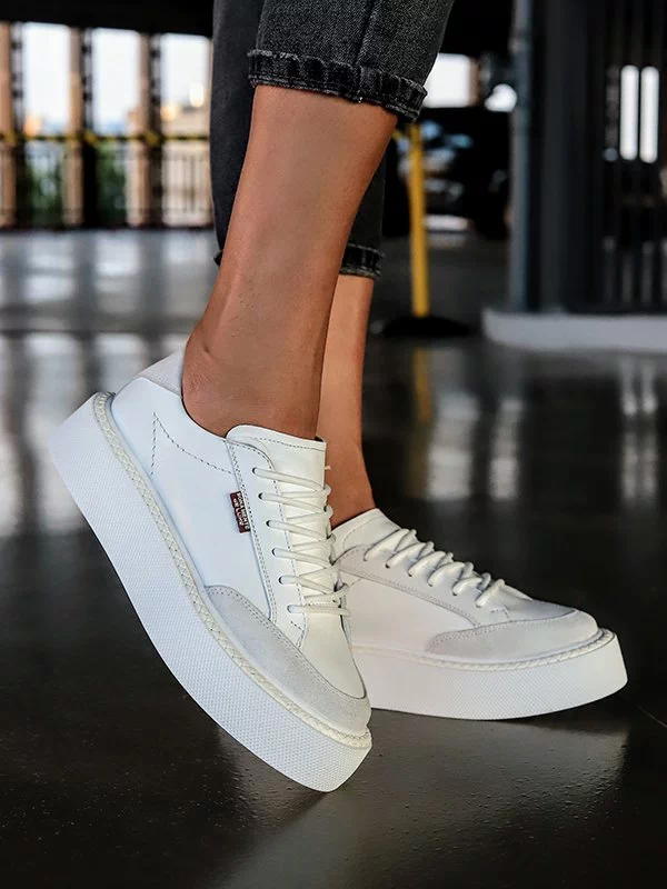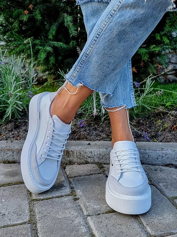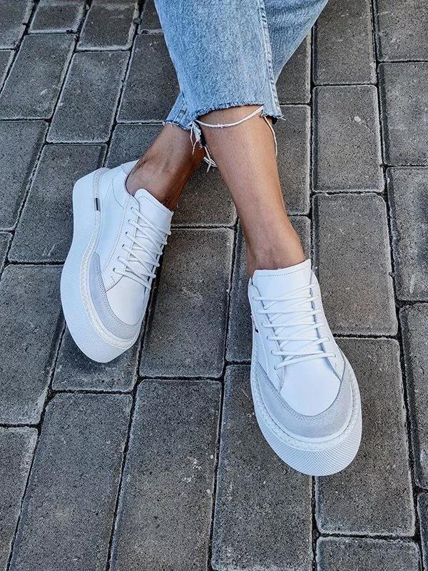 Серо-белые кроссовки на толстой подошве из кожи и замши