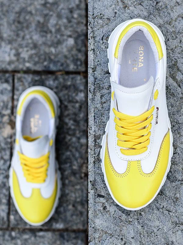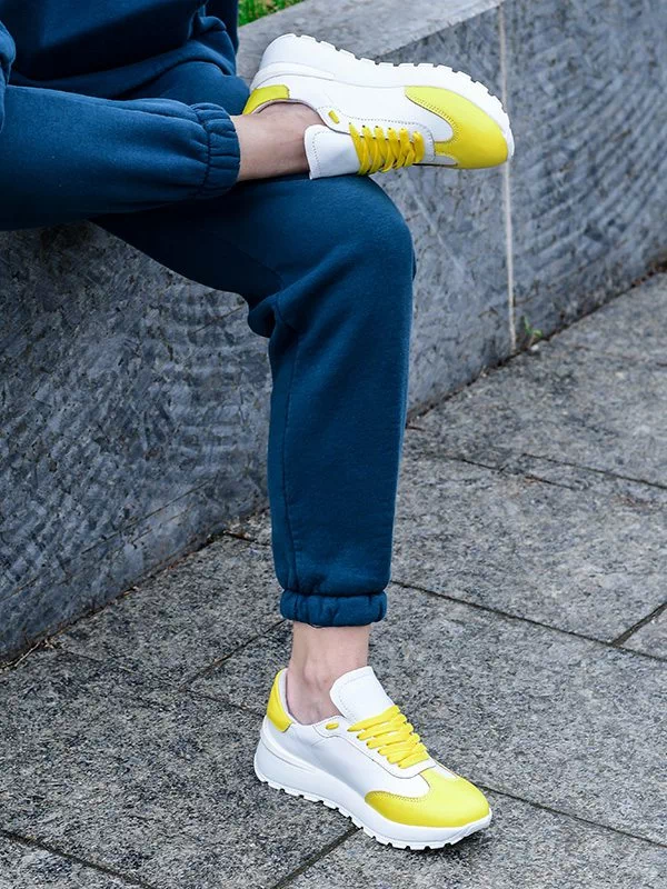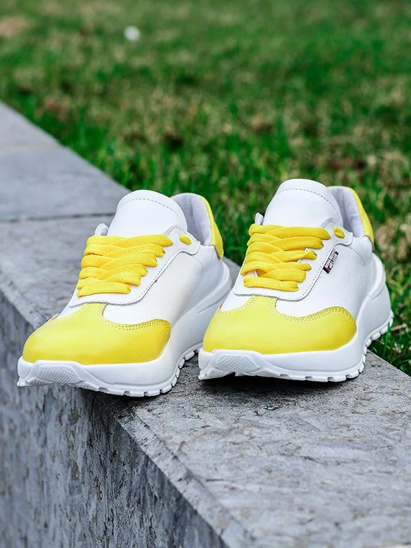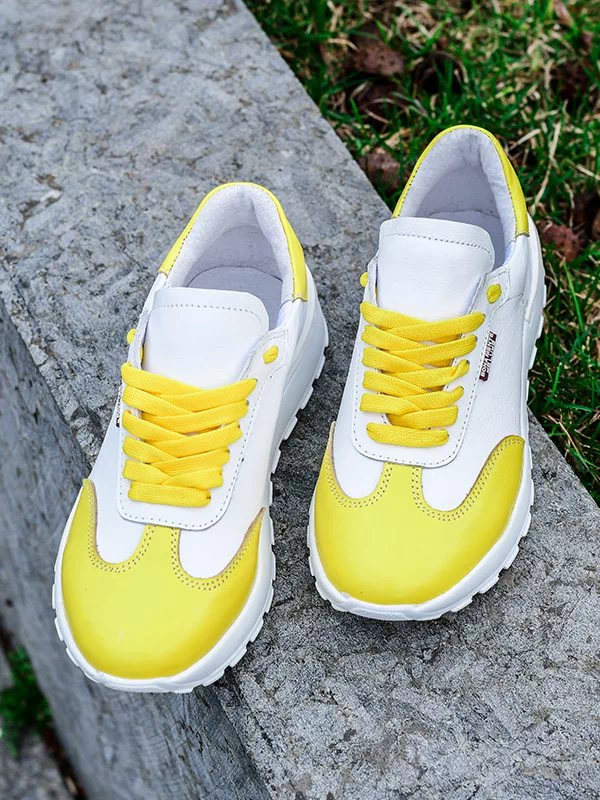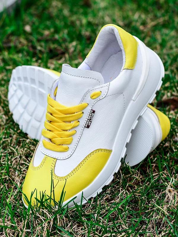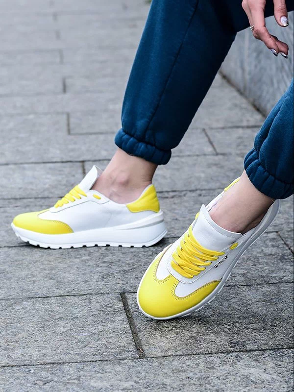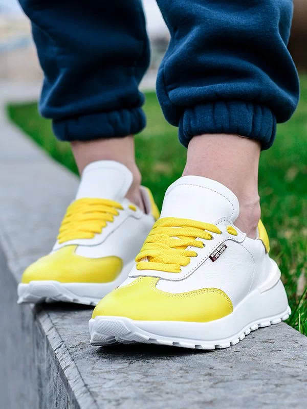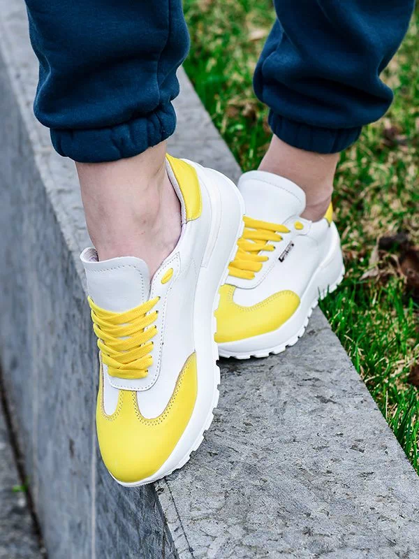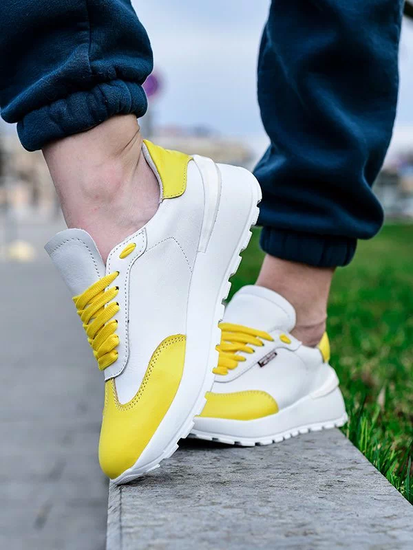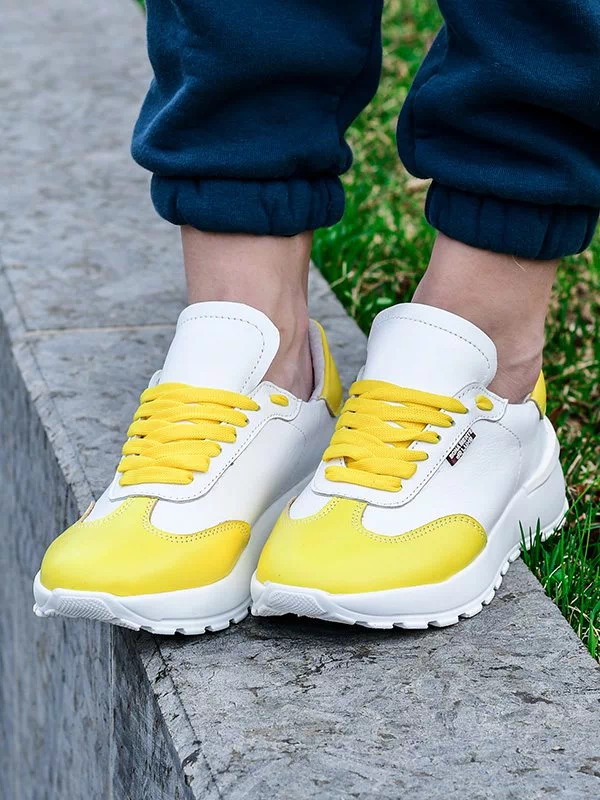 Привлекательные женские кроссовки в желто-белом исполнении на все случаи жизни.