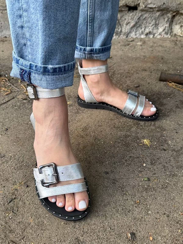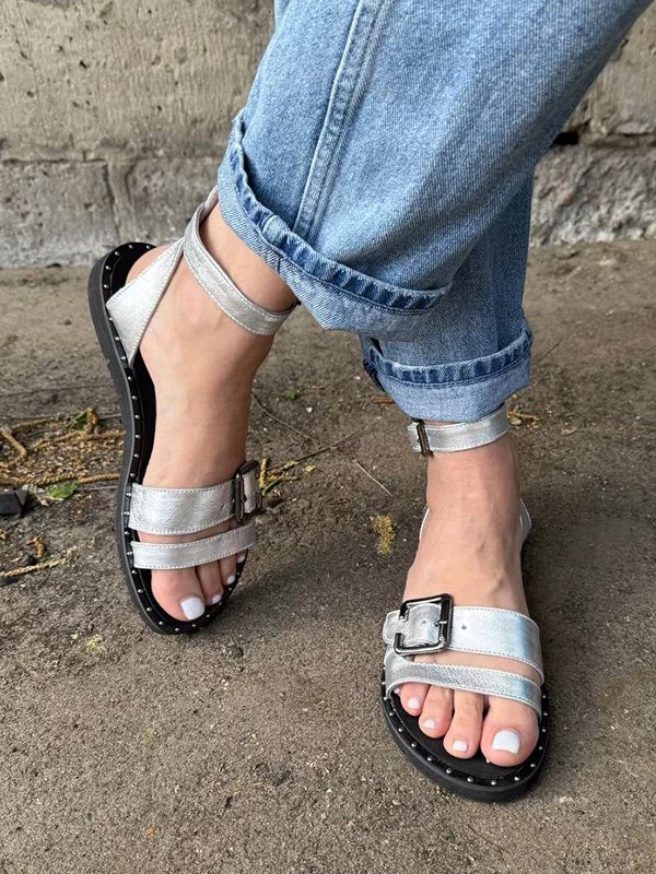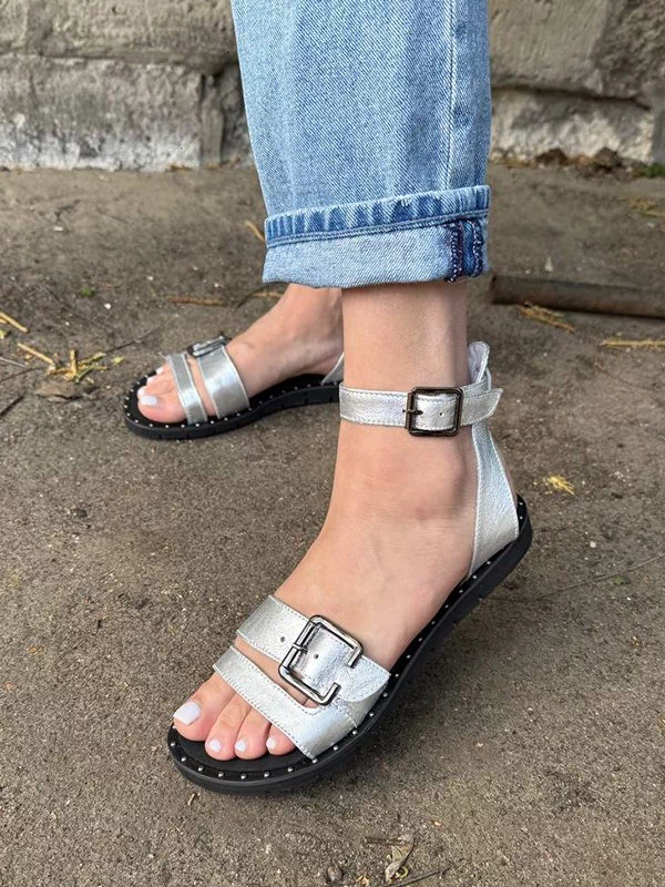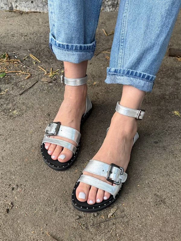 Мощные низкие женские сандалии в серебристом исполнении на все случаи жизни.